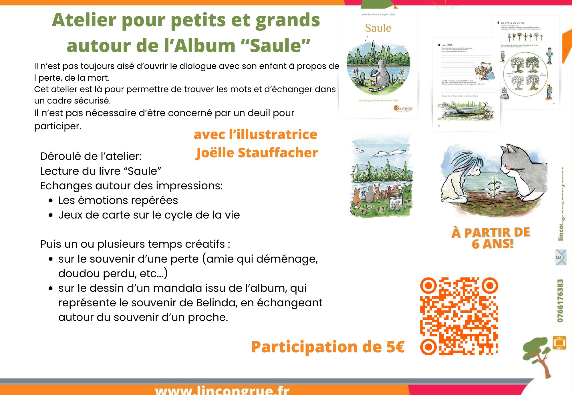 15h30 – 16h30 : Atelier pour petits et grands, animé par Joëlle Stauffacher (autrice-illustratrice) autour de son album « Saule » (sur inscription 5€) pour parler de la mort : plus d’infos: https://www.joellestauffacher.com/_files/ugd/ce0540_8afdbe48092442bd92442a9a8f60f545.pdf